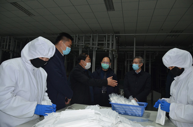 陪同參觀過程中,王力民簡要介紹了公司在疫情防控方面所做的具體工作,重點介紹了復工后的生產運營、當前口罩生產產能和新增清潔生產項目的進展情況。張忠慶一邊仔細地察看生產,一邊認真聽取企業情況,對公司有序推進生產經營,特別是完善產業發展方面的舉措給予了充分肯定,并就企業運行保障等方面的工作做了指導。