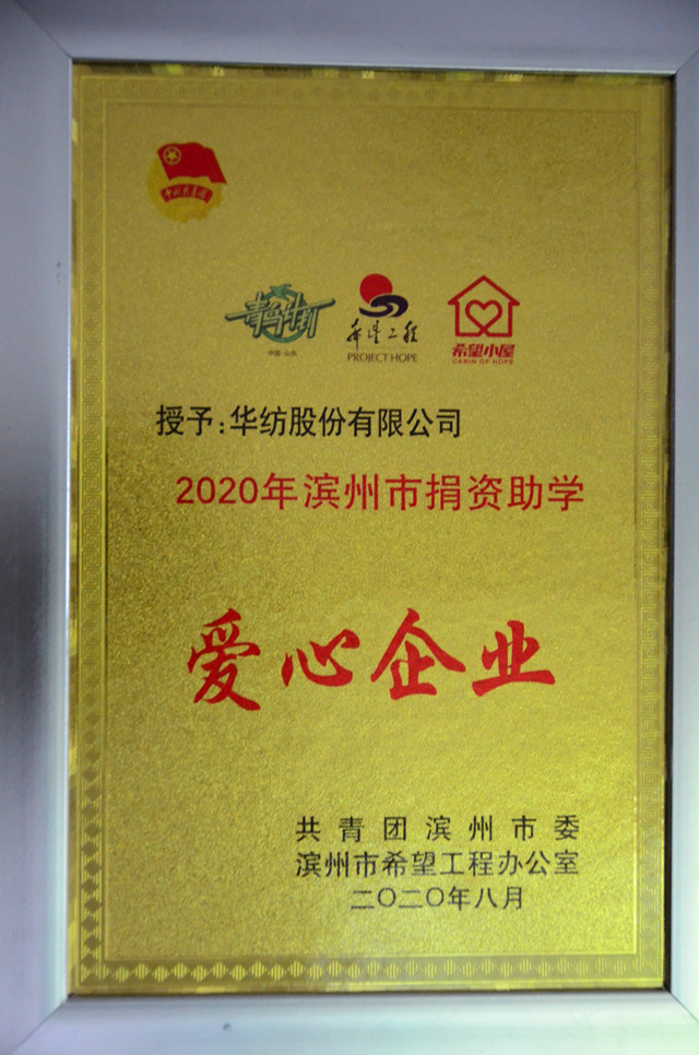 活動現(xiàn)場,公司被授予2020年濱州市捐資助學(xué)愛心企業(yè)。公司團委積極響應(yīng)團市委的倡議,組織開展了“希望小屋”愛心募捐活動,各部室、各車間組織愛心募捐,各工會干部、團支部書記踴躍帶頭,全公司廣大干部職工參與廣泛,充分體現(xiàn)出華紡人擔(dān)當(dāng)?shù)纳鐣?zé)任精神。