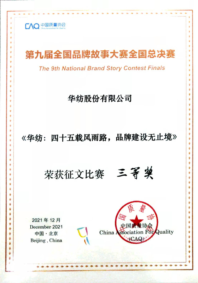 導(dǎo)讀:日前,第九屆全國品牌故事大賽落下帷幕,各獎項均有歸屬。公司文化中心陳光娥撰寫的征文作品《華紡:四十五載風(fēng)雨路,品牌建設(shè)無止境》榮獲三等獎。