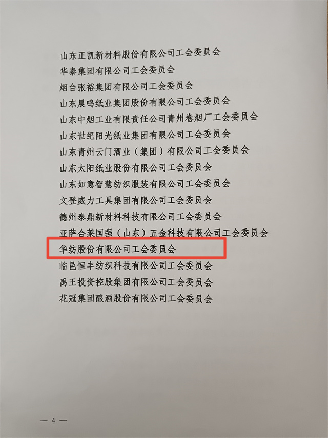 近日,省輕工紡織工會(huì)三屆四次全委會(huì)暨全省輕紡系統(tǒng)產(chǎn)業(yè)工人隊(duì)伍建設(shè)改革推進(jìn)會(huì)議在濟(jì)南召開(kāi)。會(huì)上公布了全省輕紡系統(tǒng)產(chǎn)業(yè)工人隊(duì)伍建設(shè)改革先進(jìn)單位名單,公司工會(huì)委員會(huì)名列其中。