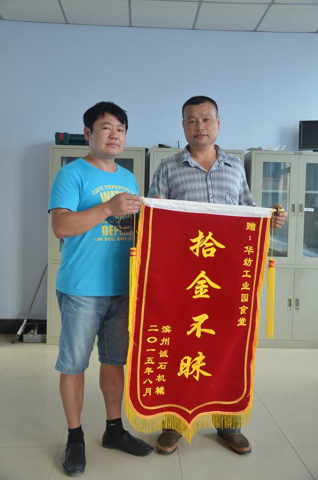 導(dǎo)讀:前不久,在公司科技產(chǎn)業(yè)園區(qū)食堂工作的陳春青收到了濱州誠(chéng)石機(jī)械工作人員送來(lái)的錦旗,在對(duì)其拾金不昧表示感謝的同時(shí),也表達(dá)了對(duì)陳春青的敬意。 就在不久前,濱州誠(chéng)石機(jī)械的工