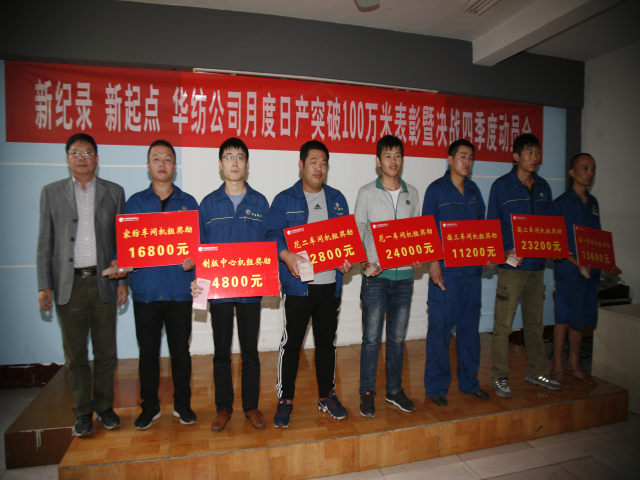 10月11日,公司召開主題為“新紀(jì)錄,新起點(diǎn),華紡公司月度日產(chǎn)突破100萬米表彰暨決戰(zhàn)四季度動(dòng)員會(huì)”,會(huì)上對在9月份印染生產(chǎn)計(jì)劃完成工作中成績優(yōu)異的55個(gè)機(jī)組和41位個(gè)人進(jìn)行了表彰獎(jiǎng)勵(lì),對第四季度工作進(jìn)行了部署。